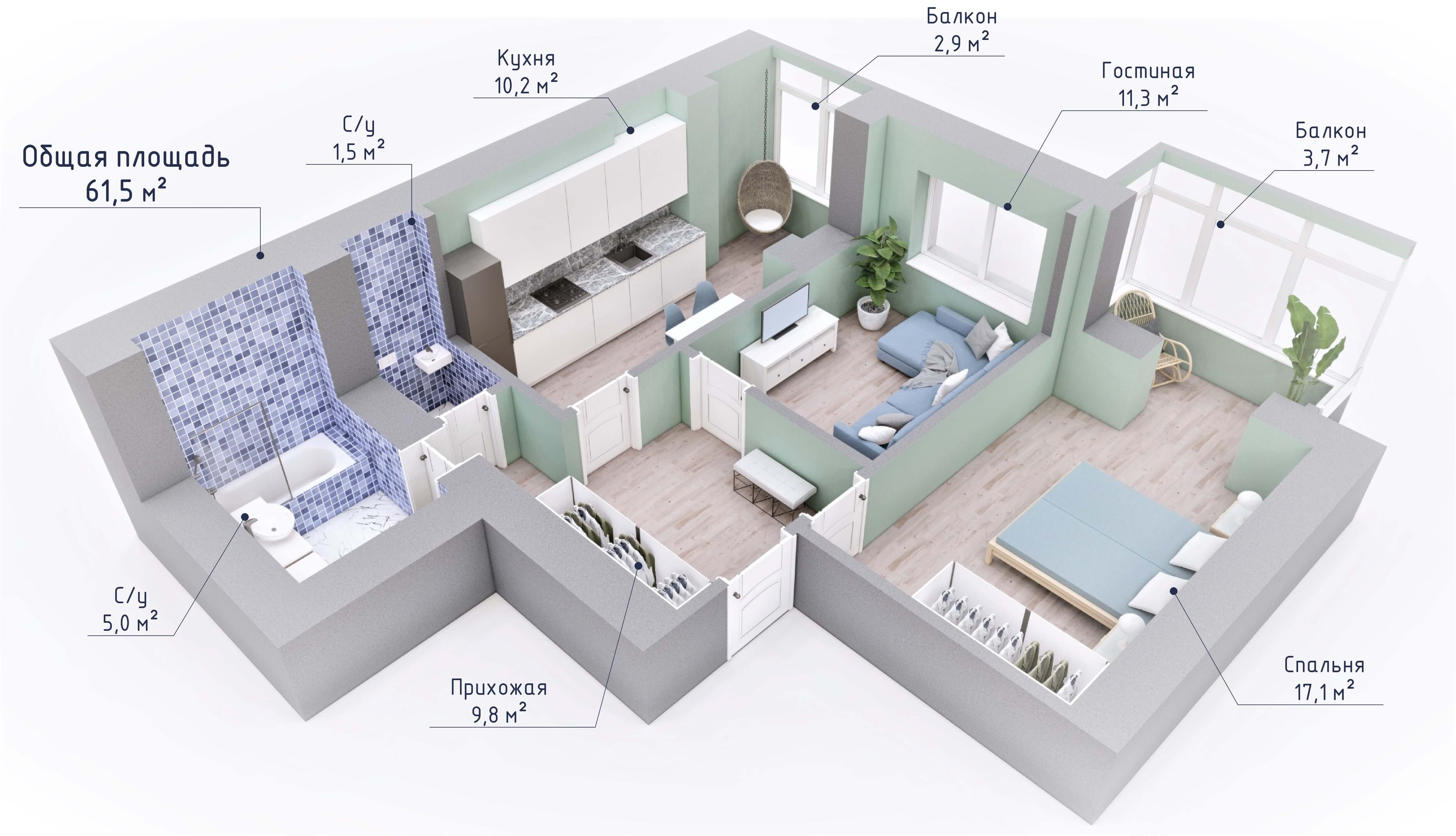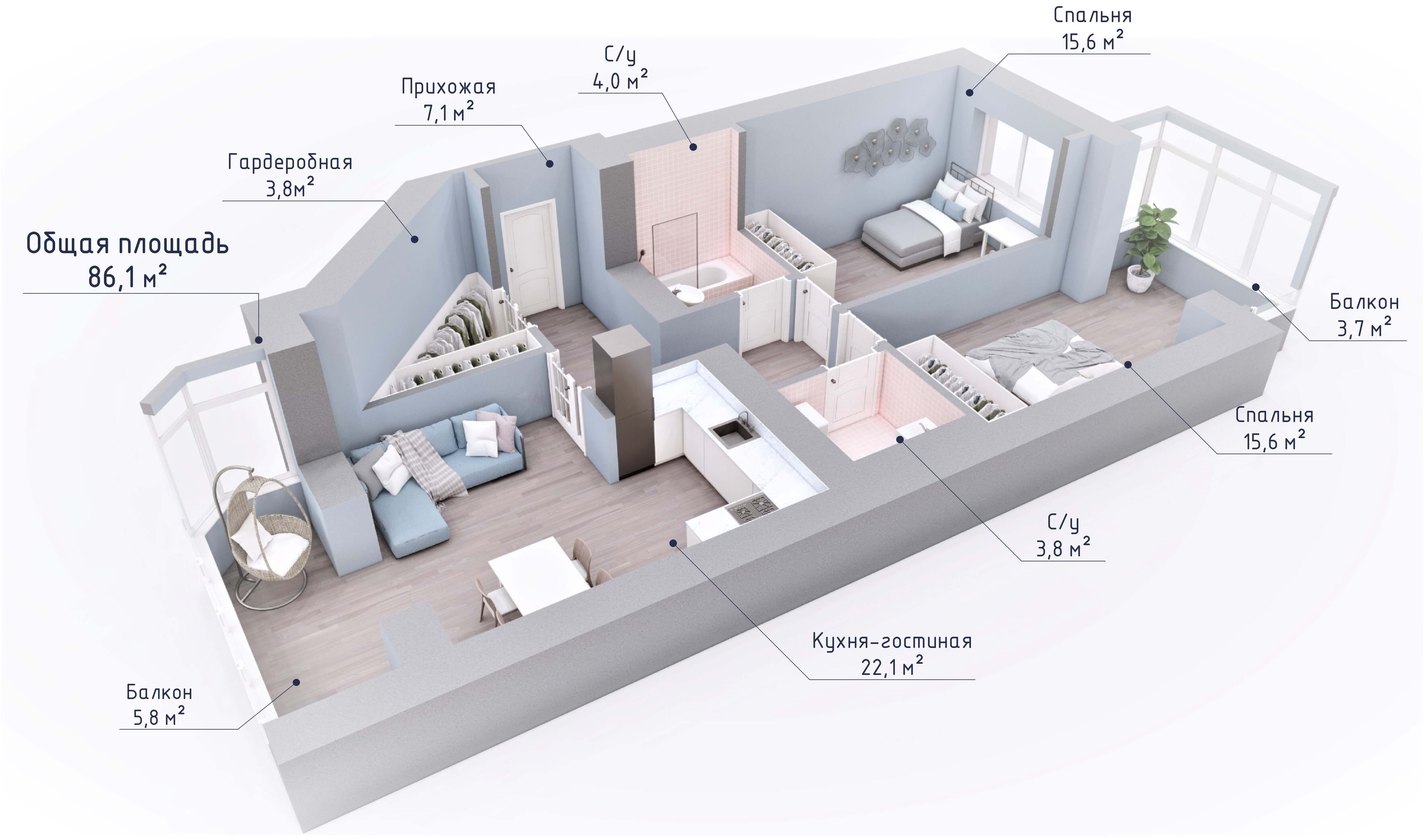 | 2кк: | 61.5 м2 | 70.5 м2 | 72.5 м2 | 86.1 м2 | ||||